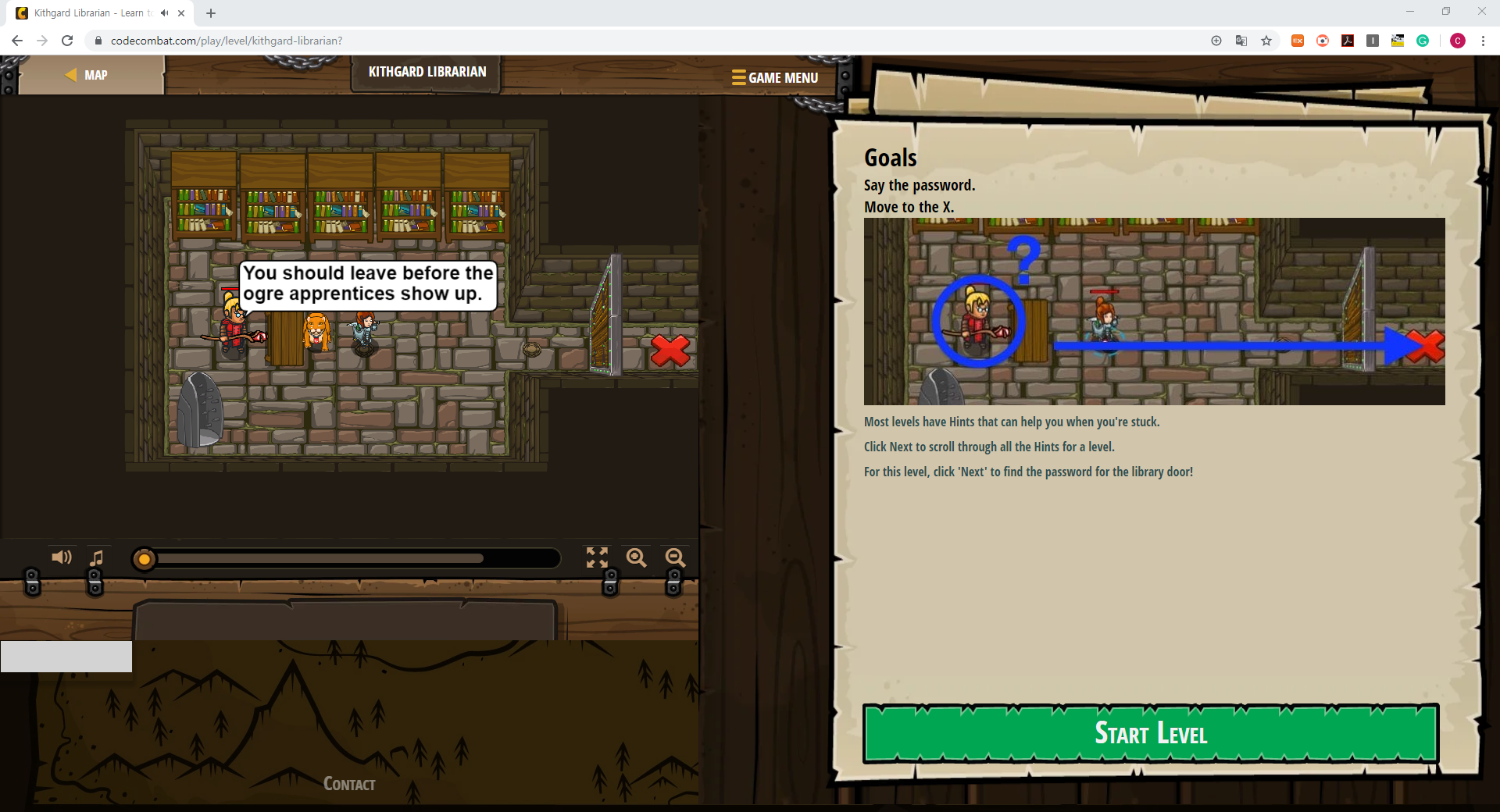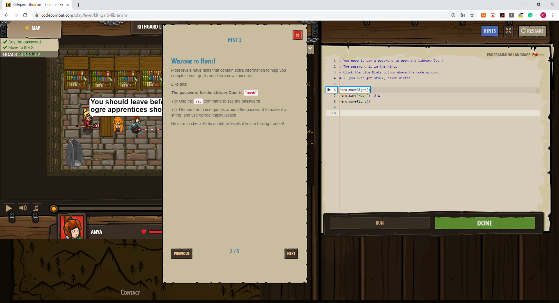 아래 그림처럼 힌트를 눌러보면 HINT 2페이지에 The password for the Library Door is "Hush"라고 명시 되어 있고,