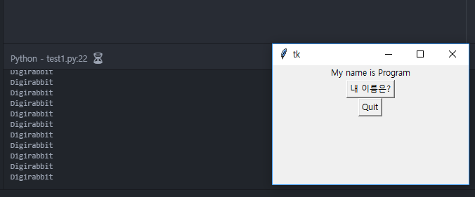 아래와 같이, '내 이름은?' 버튼을 클릭하면 Digirabbit 메시지가 출력되며,